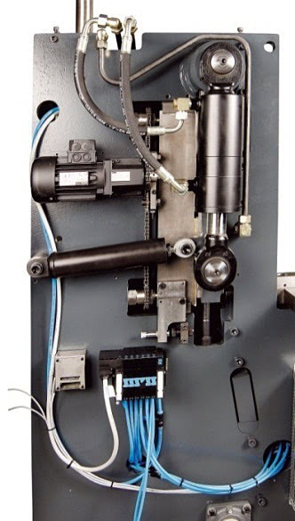Во-первых — это нестандартная гидросистема с двумя контурами, а уникальна схема, в которой во время рабочего хода подъема и опускания левый и правый гидроцилиндры связаны магистралью с фиксированным объемом масла. При этом насос подает рабочую жидкость только в один цилиндр, поршень которого, в свою очередь, выталкивает масло во второй цилиндр. Из-за равенства объемов перекачиваемого масла между цилиндрами не нужно следить за положением балки и справа, и слева. При этом есть возможность изменения объема в замкнутой системе, что позволяет изменять угол наклона верхнего ножа. Достаточно только одной линейки и одного рабочего клапана. Благодаря этой конструкции станки SafanDarley получают ряд преимуществ по сравнению с любыми другими гильотинными ножницами.