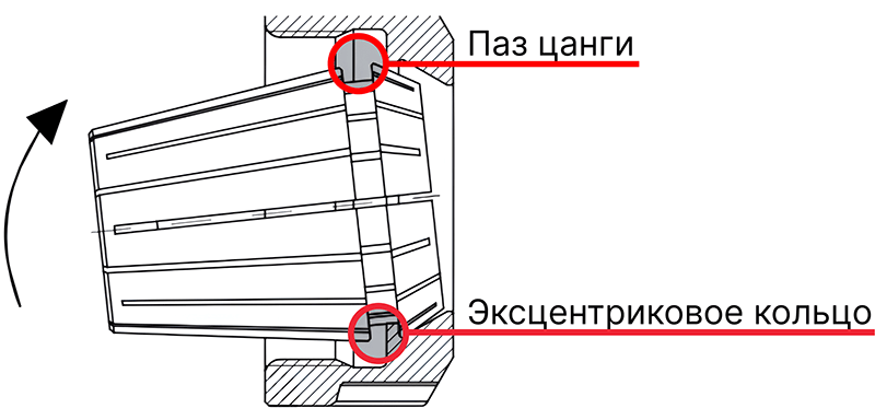 Вставьте паз цангу в эксцентриковое кольцо зажимной гайки.