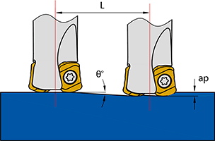 Максимальный угол врезания θ (°) | Максимальная глубина резания a p (мм) | Минимальная длина врезания при максимальной глубине резания (a p ) L (мм) | HD min (мм) | HD max (мм) | ||