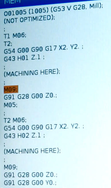 В каждой строке этой программы заложена пустая трата времени. Лучше бы было удалить все эти строки программы. Когда они удалены, ЧПУ автоматически одновременно выключит подачу СОЖ, переместит ось Z в положение смены инструмента и остановит шпиндель. Это все делается одновременно вместо того, чтобы ждать, пока завершится каждая строка программы.