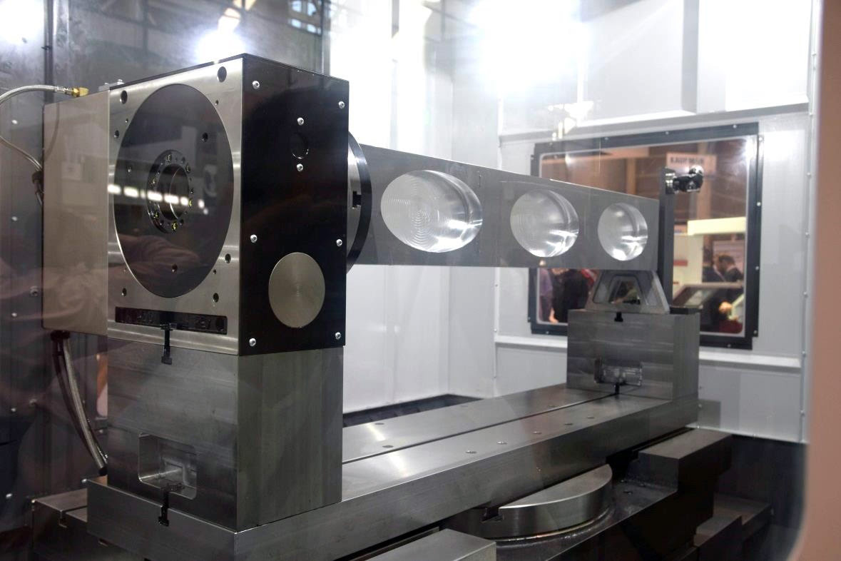 Поворотные оси UMC-750P настроены иначе, нежели в других станках HAAS серии UMC. Вращающаяся планшайба была заменена фиксированным столом, на котором смонтирован поворотный стол HRT210 с поддержкой А-образной рамы. B-ось обеспечивает угол наклона ±47°, а HRT210 обеспечивает поворот на 360° оси А для лучшего доступа инструмента и обработки деталей больших габаритов.