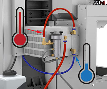 Охладитель снижает температуру охлаждающей жидкости перед ее подачей в станок. Теплая СОЖ из бака по красным шлангам поступает через фильтр в охладитель (см. рис.). Из охладителя жидкость по синему шлангу через рубашку охлаждения шпинделя поступает в сопла подачи СОЖ.