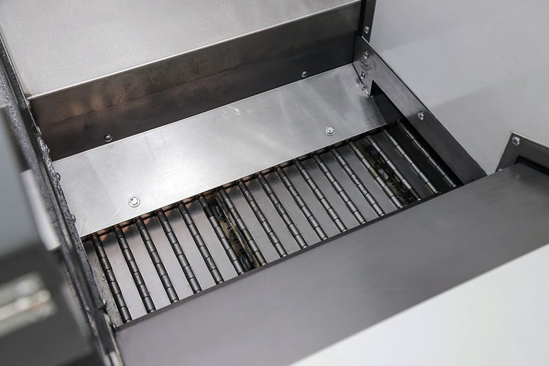 Широкий ленточный транспортер для удаления стружки, расположен в центральной части станка. Вертикальные стенки ограждения способствуют попаданию стружки на конвейер. Стружка выгружается на высоте стандартной промышленной бочки.