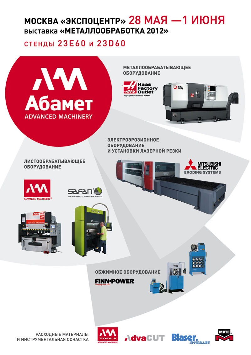 Компания «Абамет» приглашает Вас посетить свои стенды на выставке «Металлообработка 2012» , которая пройдет в «Экспоцентре» (Москва) с 28 мая по 1 июня 2012 года. Вы сможете увидеть металлообрабатывающее оборудование ведущих мировых производителей.