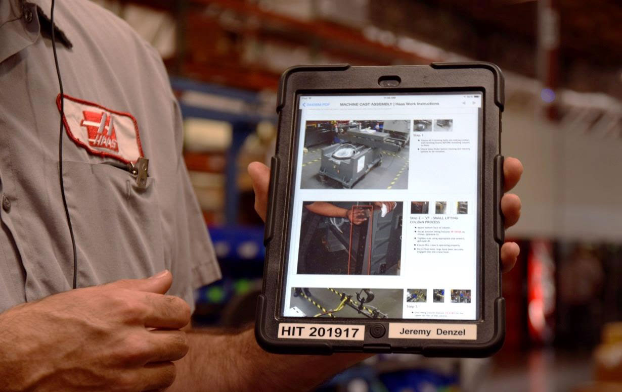 HAAS полностью перешел от бумажной документации к электронной. Все производство отслеживается в онлайн-режиме через планшет. Каждый сотрудник имеет именной планшет с доступом к просмотру наличия необходимых деталей на складе, их готовности для сборки, стадии сборки станка или определенного его узла, задержкам и отставаниям по графику сборки. Также у каждого специалиста на производстве в планшете имеется подробная инструкция с иллюстрациями по сборке узлов станка.