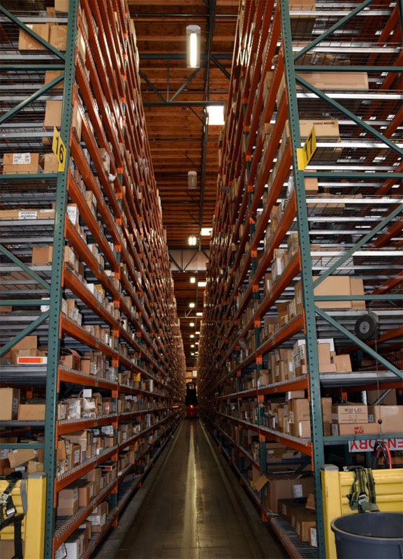 На складе хранятся все запчасти и детали станков. Необходимые комплектующие перемещаются на стеллаж и забираются со стеллажа оператором с помощью электроштабелера. В будущем планируется роботизировать способ поиска нужной позиции.