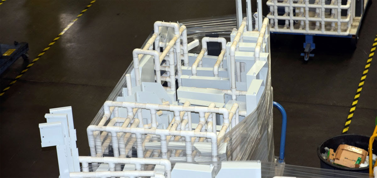 Сборочные участки занимают большую площадь. Сборка ведется на отведенных участках монтажа (механическая часть, электрическая часть, финальная сборка). Станки в процессе сборки перемещаются от одного участка к другому. Комплектующие кожухов перемещают на тележках в специально спроектированном каркасе из труб.