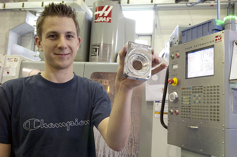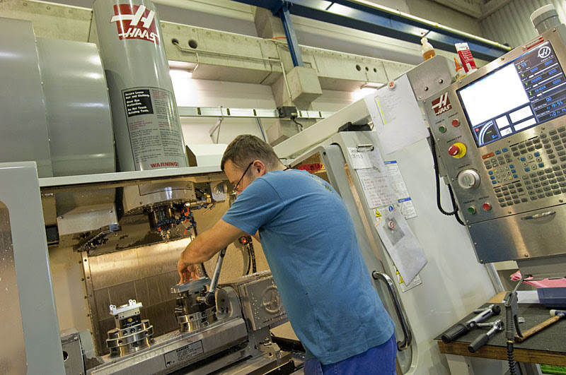 Для того чтобы головка камеры SI-2K была максимально маленькой и легкой, производственный отдел компании P+S TECHNIK Präzisionsteile GmbH изготовил ее из алюминия на последнем высокоскоростном фрезерном станке VF-3SS компании Haas с наклонно-поворотным столом TR160 . Рассказывает Ричард Вагнер (Richard Wagner) , глава данного отдела: «Haas позволила нам осуществлять точное фрезерование параллельных поверхностей межу линзой и опорной поверхностью датчика с допуском ±0,01 мм. Она также позволила создать мелкую резьбу M2×0,25 и высококачественные поверхности (очень важно, чтобы детали выглядели так же хорошо, как и работали). Для машинной обработки мы устанавливаем деталь в высокоточный зажим, используя специальные зажимные губки».