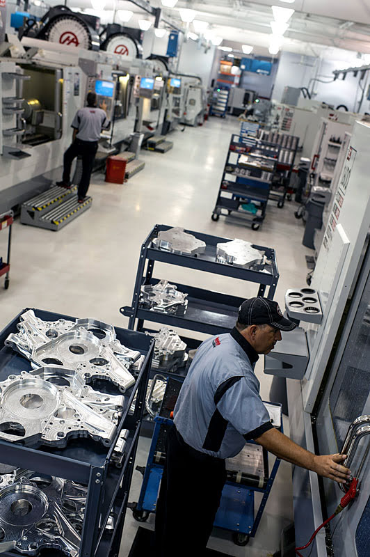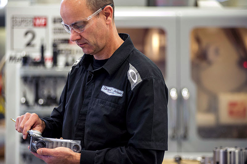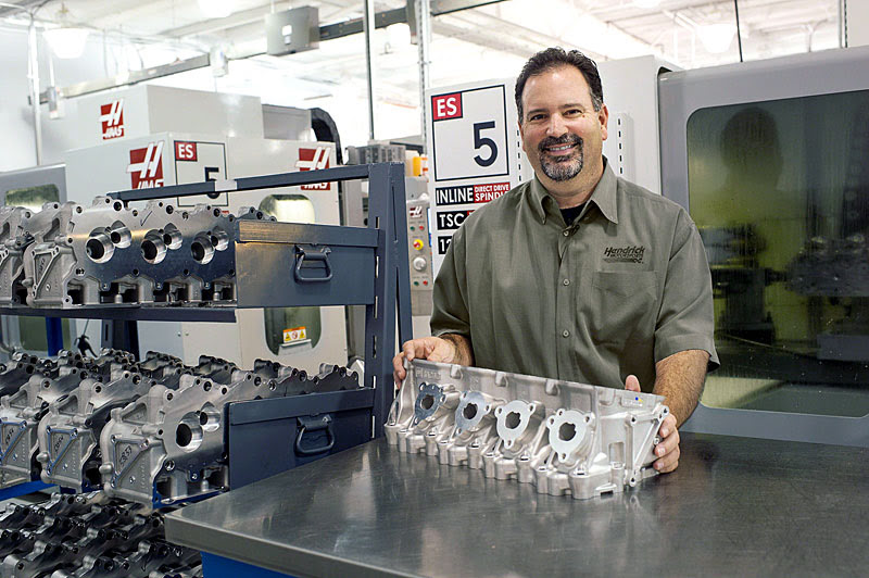 Головки цилиндров HMS обрабатывают посредством горизонтальных обрабатывающих центров ES-5 Haas. Эти сложные детали начинают свою жизнь как наполовину обработанные литые детали, поставляемые Chevrolet.