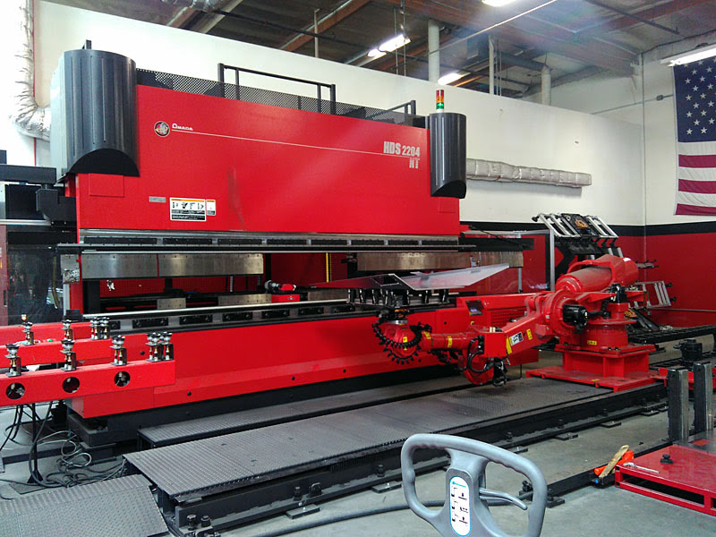 Производство кожухов станков также оснащено по первому слову техники, работают сварочные роботы. Гибка листовой заготовки осуществляется также при помощи листогибов с роботами. Раскрой же происходит как на лазерных станках , так и на координатно-пробивных прессах Trumpf. Результат — супер: зазоры ровные, сварочные швы выглядят идеально.